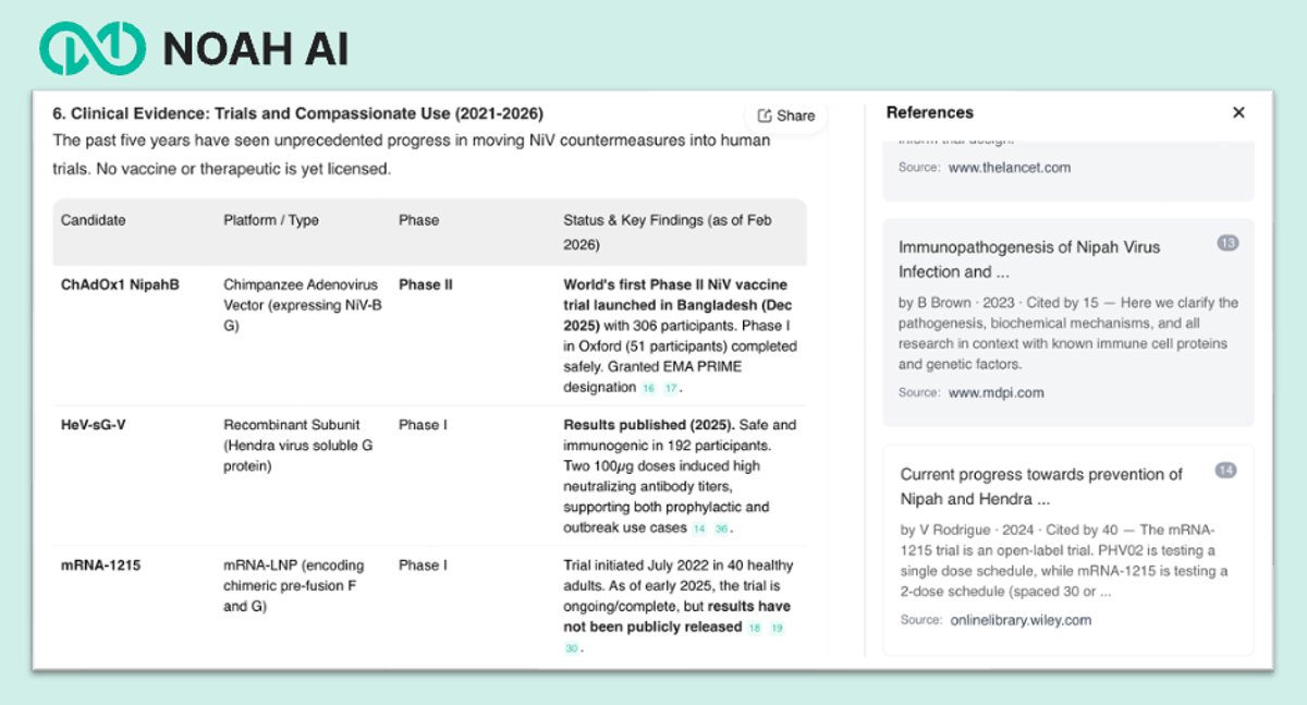 Figure 2. Summary table with citations generated by Noah: ongoing clinical studies on candidate vaccines for NIV virus.