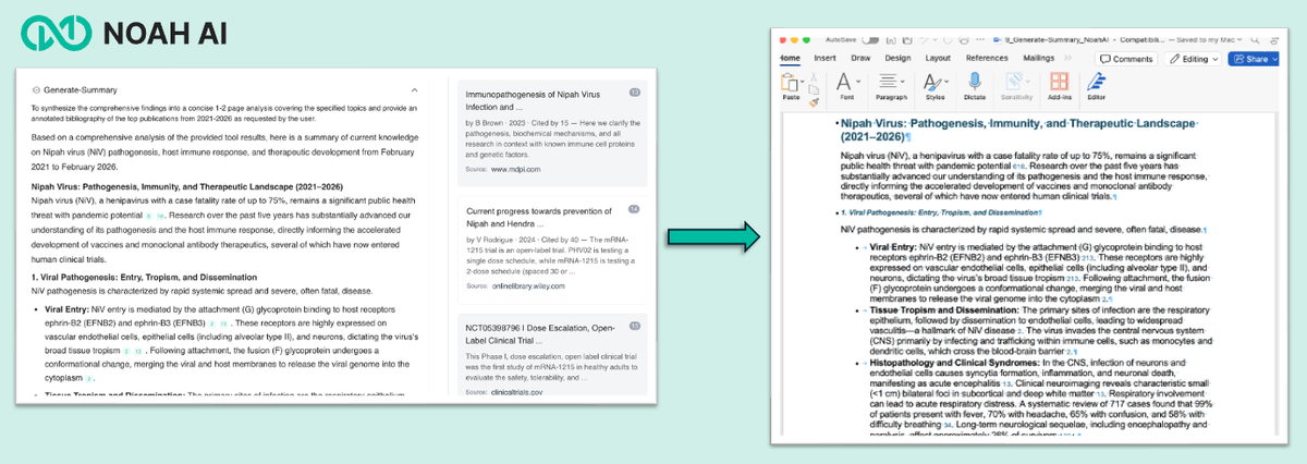 - Structured outputs and revisable: Noah delivers results in clear tables and formats to compare findings and reproduce the similar analysis across different topics.