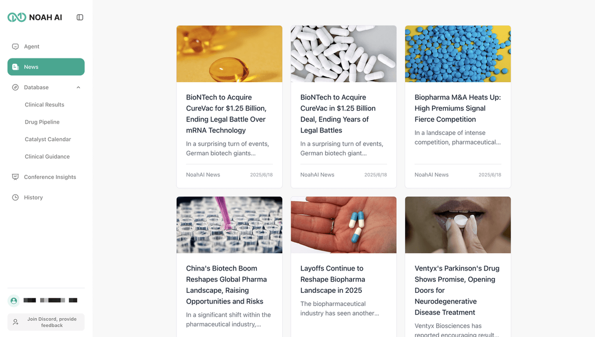 Log in to Noah AI and head to the "News" section from the left sidebar to stay on top of the latest biopharma trends.