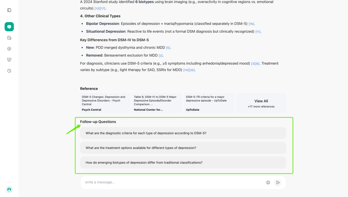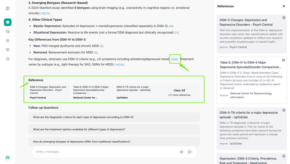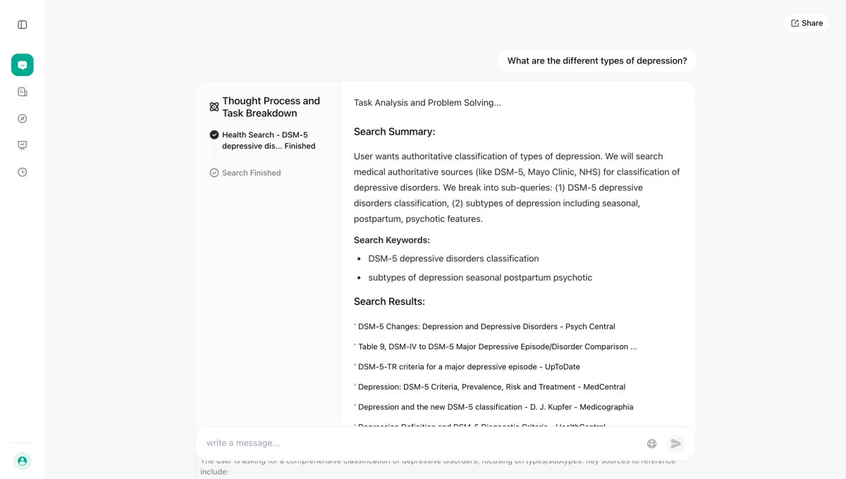 First, let’s enter a specific question, such as “What are the different types of depression?”, into the AI search box. Please make sure to click on "Agent" in the sidebar, then select both "Search" and "Health".
